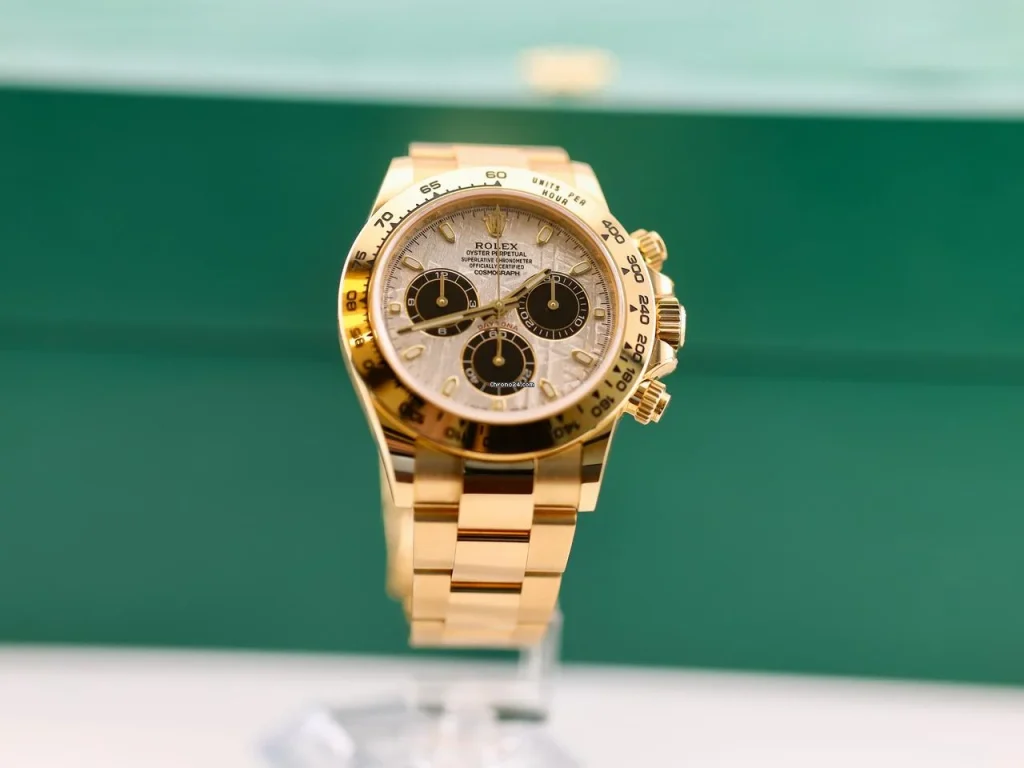The Replica Rolex Daytona Meteorite Dial 116508 is perhaps the ultimate example of how sport and luxury can coexist in perfect harmony. Crafted entirely in 18k yellow gold, the watch is powered by Rolex’s in-house Calibre 4130, a chronograph movement celebrated for its precision and reliability. What truly sets this model apart, however, is the meteorite dial—a surface cut from a fragment of an actual meteorite that fell from space millions of years ago. The silvery, streaked pattern of the dial ensures that no two watches are ever identical. This combination of cosmic rarity and Rolex engineering results in a watch that feels both powerful and poetic. The Daytona remains one of the most iconic chronographs ever made, and in gold with a meteorite dial, it commands attention without a single word. It’s the kind of watch that transitions effortlessly from the racetrack to a black-tie dinner, capturing the spirit of adventure wrapped in pure gold.